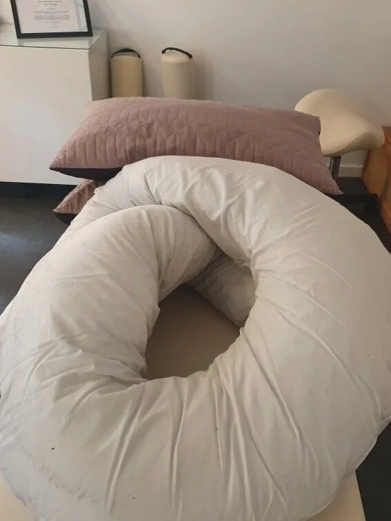 Jeg har en behagelig massagepude, egnet til netop gravid massage, som vi anvender under din behandling hos mig. Puden formes, så den skaber et hul til maven i midten, og du derfor kan ligge på maven med fri adgang til ryg og lænd, hvor der oftest er størst problematikker. Puden sikrer, at resten af din krop er godt støttet hele vejen rundt.