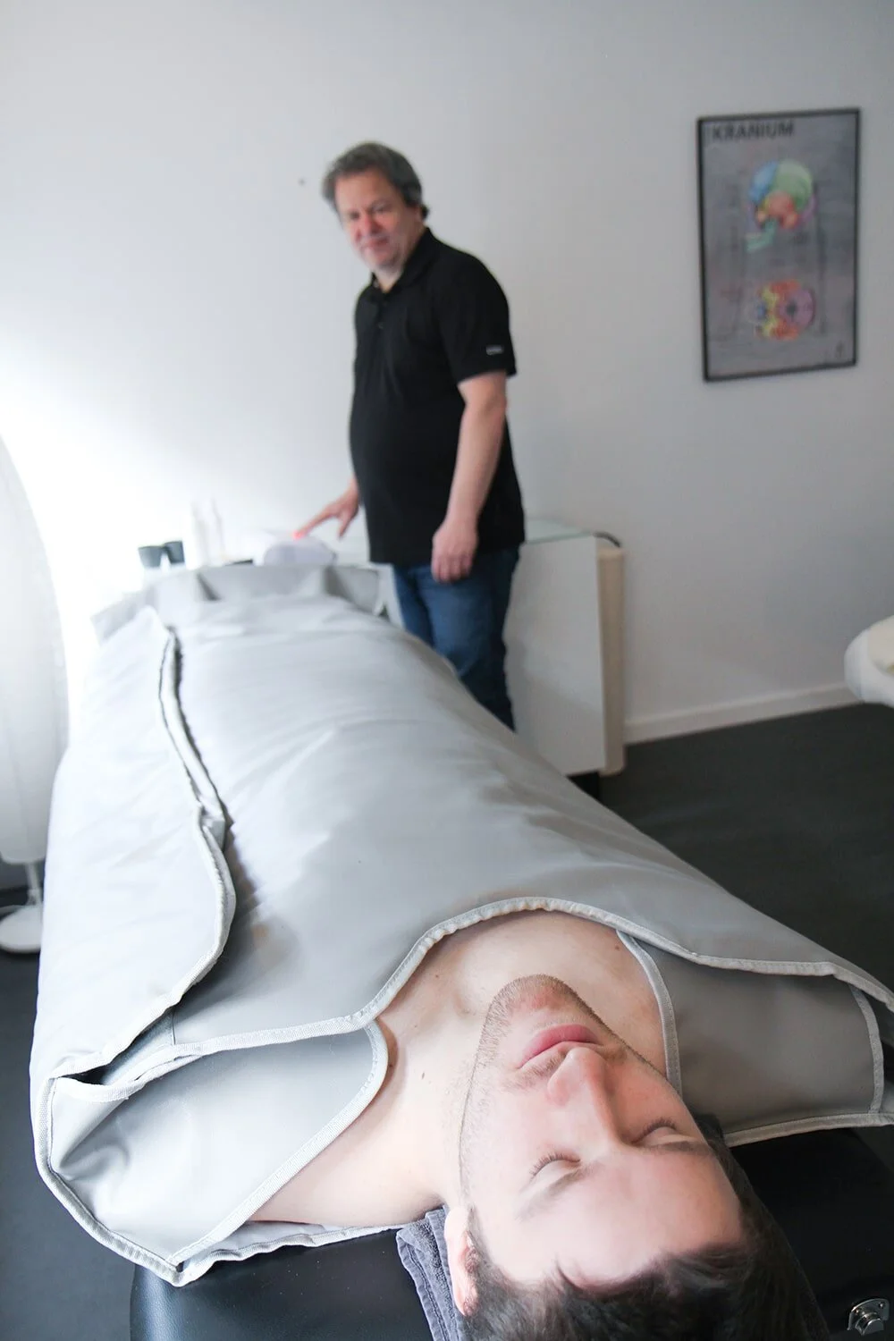 Jeg tilbyder infrarød behandling med et infrarødt varmetæppe, som du lægges i og som stille og roligt varmer din krop op i 45-60 min. Denne metode kaldes også ofte “infrarød sauna”.